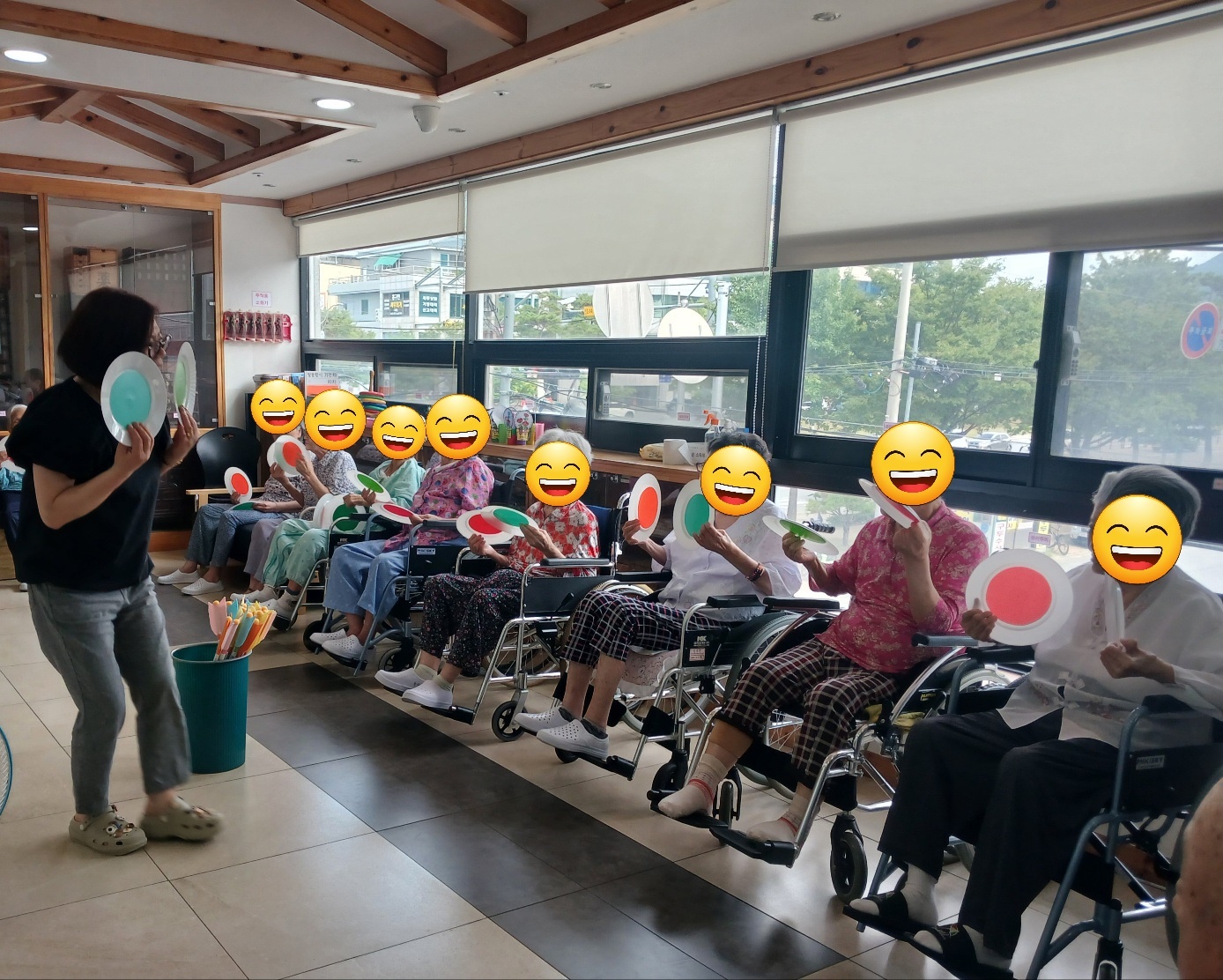 리듬에 맞춰 접시를 두드리며 박자를 잘 맞추시고 노래를 부르시며 율동을 즐겁게 하셨어요