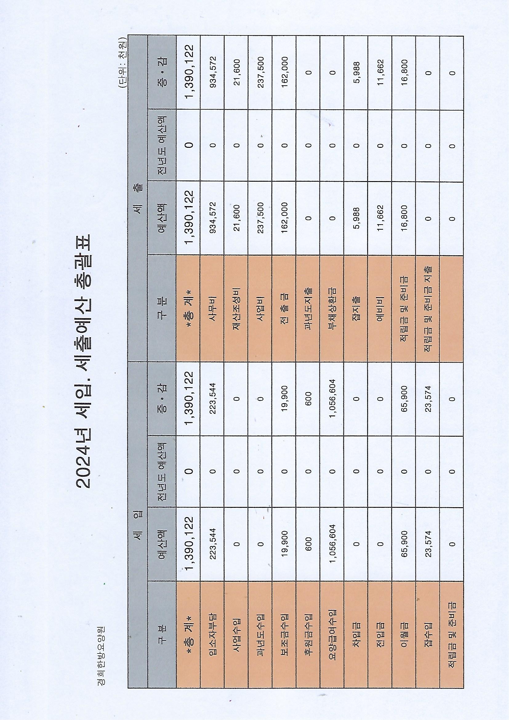 2024년 세입, 세출예산 총괄표 [이 게시물은 최고관리자님에 의해 2025-12-30 11:11:50 경희한방요양원 공시사항에서 이동 됨]