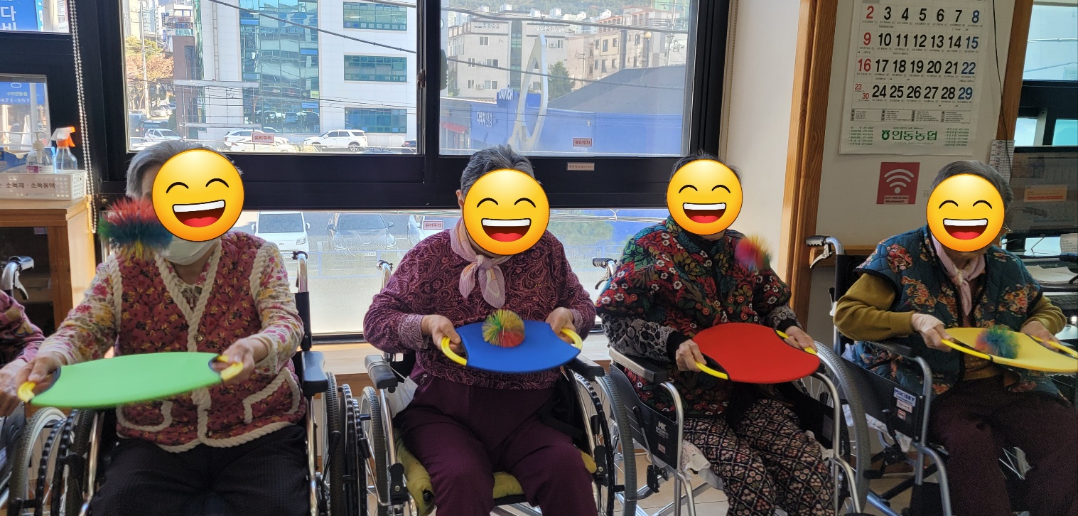 어르신들과 함께 가볍게 몸을 풀어보는 뽕망치 체조 어깨와 팔, 등을 두드리며 혈액순환도 돕고, 두드릴 때마다 웃음도 피어나 활기찬 시간이 되었습니다. 이어서는 둥근 원반 위에서 실리콘 공을 튕기는 팡팡 공 튕기기 활동을 진행했습니다. 두분씩 주고 받기도 하시고공이 떨어지지 않도록 집중하시며 더 높이, 더 오래 튕기려는 모습에 즐거운 경쟁도 생기며모두가 흥미롭게 참여해주셨습니다. 오늘도 어르신들의 밝은 웃음 덕분에 즐거운 시간이었습니다