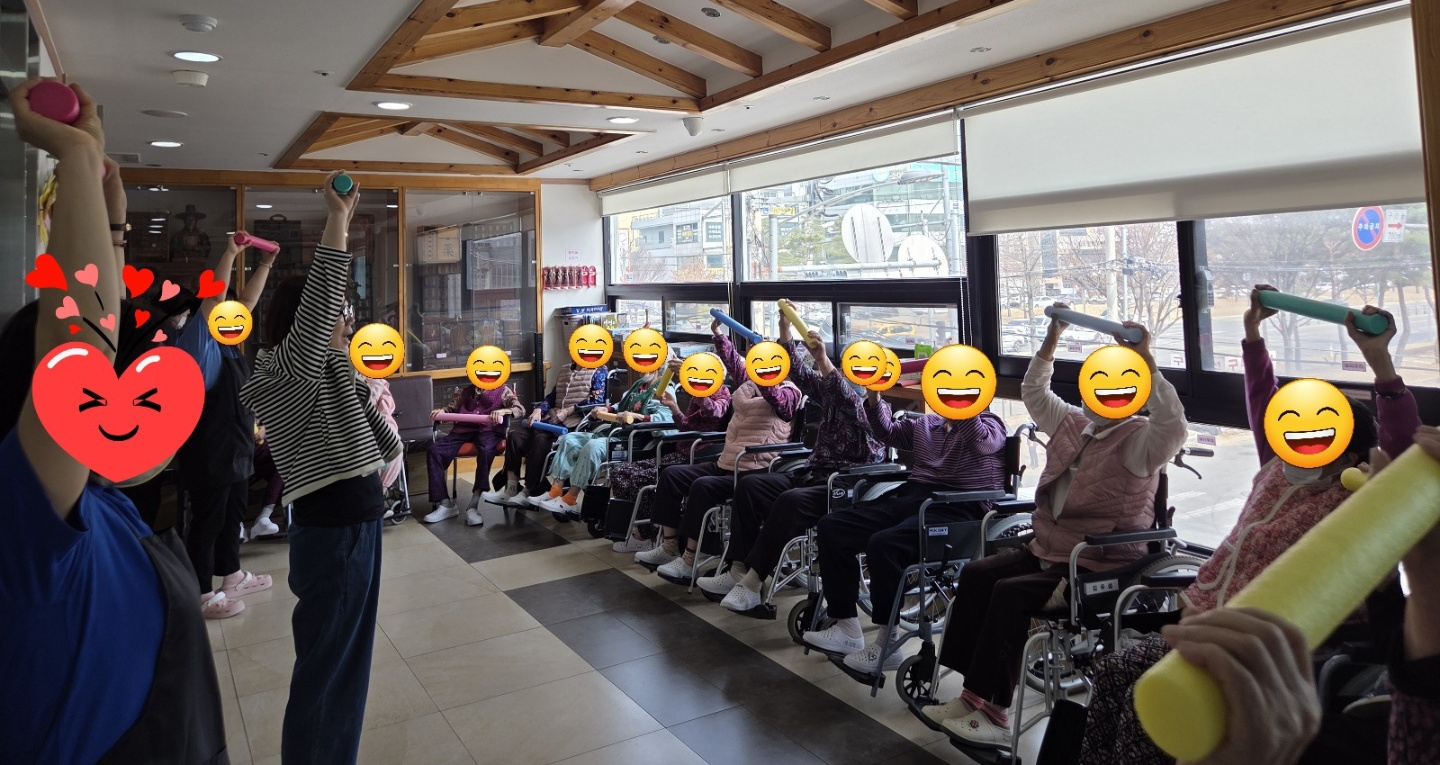 백업을 활용한 음악에 맞춰 몸을 풀며 즐겁게 체조에 참여하셨습니다.